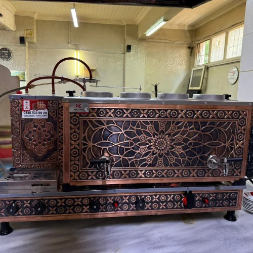 4 demlikli bakır çay kazanı, geniş servis kapasitesi ve dengeli ısı dağılımı sağlayan bakır gövdesiyle profesyonel işletmeler için uygundur. Çayın ideal sıcaklıkta ve lezzette servis edilmesine yardımcı olur.
